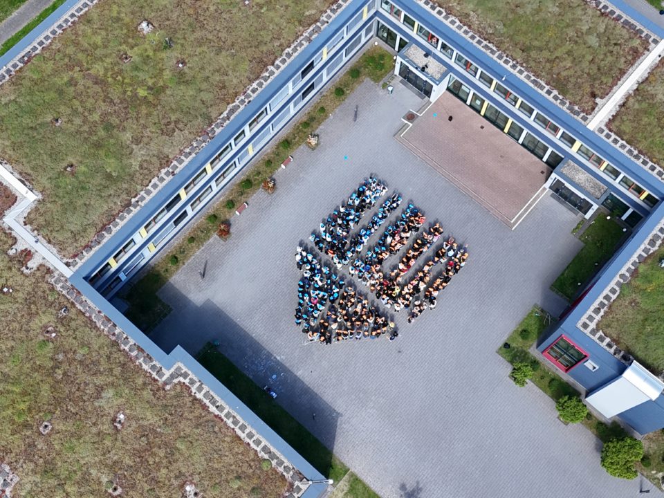 Gemeinschaftsaktion mit Weitblick – Drohne fängt Schullogo mit allen ein