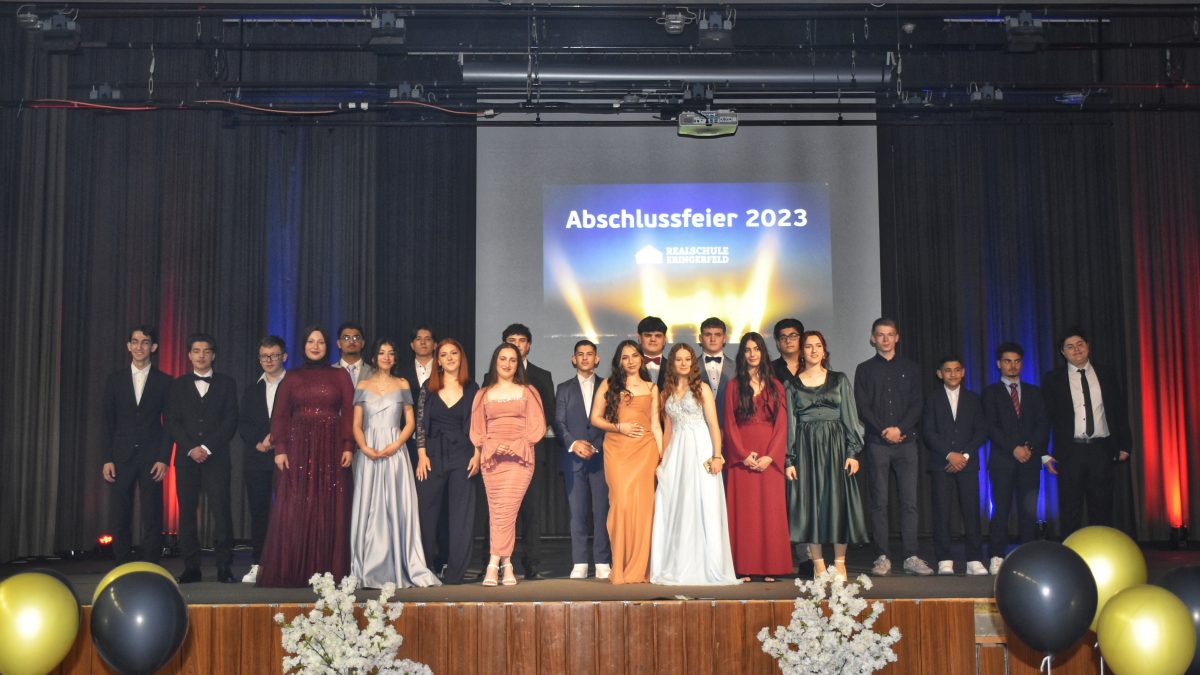 Wenn man zurecht stolz auf sich sein darf, kann man das auch feiern… Mit ihrer emotionalen Abschlussfeier am 07.06.2023 in der Aula der Schulen Eringerfeld setzte die Abschlussklasse der Realschule Eringerfeld den Schlusspunkt unter ihre bisherige Schullaufbahn. Wie der Schulleiter, Herr Türkoglu, in seiner Rede betonte, war es ein überaus erfolgreicher Jahrgang, in dem nicht nur alle 22 Schüler/innen die Fachoberschulreife (Realschulabschluss) erreicht haben, sondern auch 17 Schüler mit dem Q-Vermerk die Berechtigung zum Besuch der gymnasialen Oberstufe erlangten. Neben viel Lob musste er aber zudem bemerken, dass das Leben auch „Rückschläge“, wie die vernichtende Niederlage der Schülermannschaft gegen das Lehrerteam im traditionellen Fußballspiel am Chaostag, mit sich bringt. Zur Verdeutlichung wurden die schönsten Tore des Lehrerteams noch einmal im Video gezeigt. Die Schüler/innen nahmen diesen Seitenhieb mit Fassung hin, denn sie wussten, dass sie nun nicht mehr lange bis zur Übergabe der Abschlusszeugnisse warten mussten.