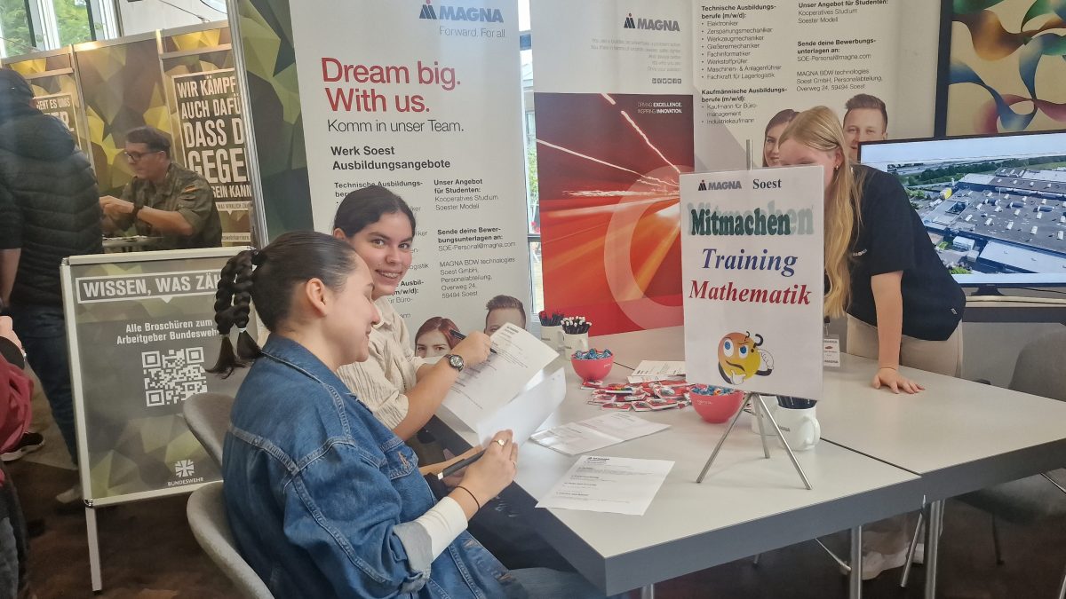 Dass in Zeiten des Fachkräftemangels zukünftige Mitarbeiter/innen ein hohes Gut sind, war auch daran erkennbar, dass die Schüler/innen an vielen Ständen mit Werbegeschenken, Mitmachangeboten oder Gewinnspielen begrüßt wurden. Auch die begleitenden Klassenlehrer, Herr Karakus und Herr Temme, waren vom vielfältigen Angebot des Ausbildungsmarkts Hellweg 2023 beeindruckt und überzeugt, dass ihre Schüler/innen an diesem Tag einige Schritte in Richtung Zukunft gemacht haben.
