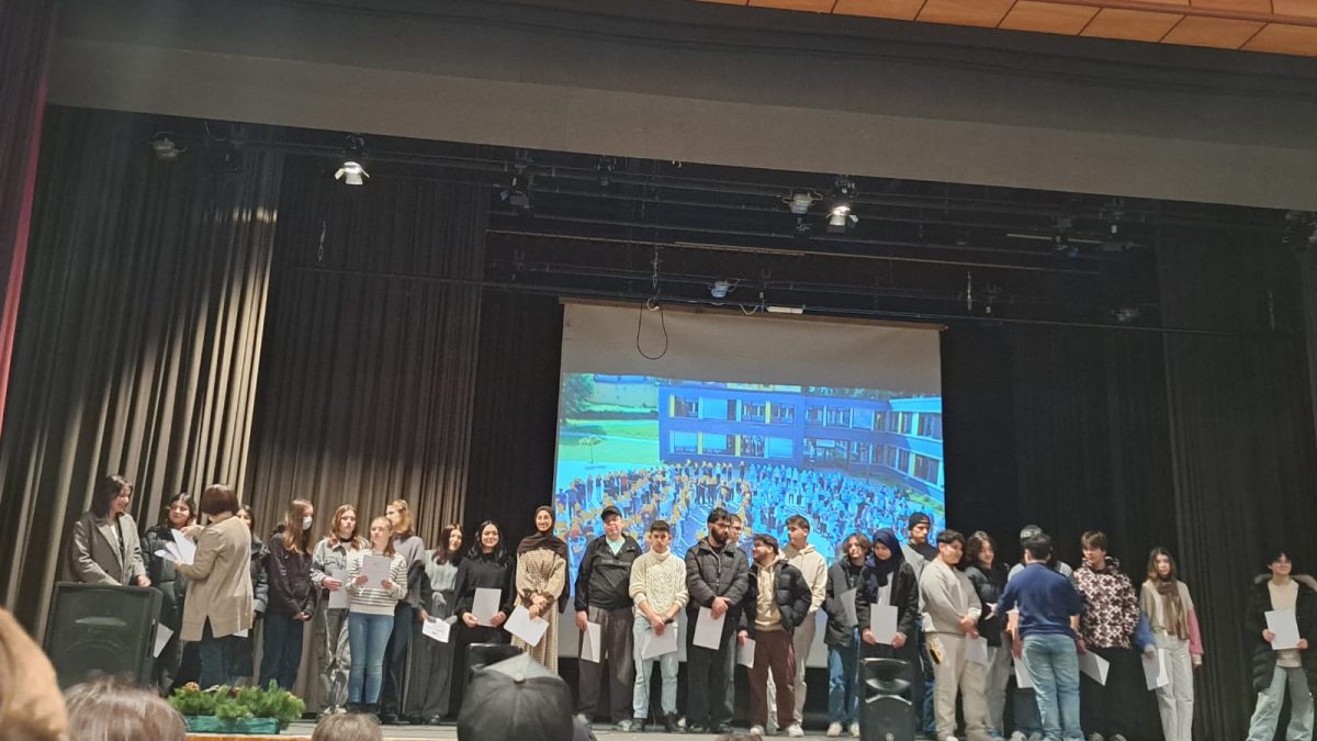 Danach kamen zwei Schülerinnen aus der Oberstufe auf die Bühne und stellten ihre Anti-Rassismus-AG vor. Sie kümmern sich dieses Jahr darum, dass unsere Schule kein Platz der Ausgrenzung aufgrund von Hautfarbe, Glaube, Aussehen, Herkunft, Sexualität ist und Mobbing bekämpft wird. Ein sehr wichtiges Thema, welches durch ihre AG die Aufmerksamkeit bekommt, die es verdient.