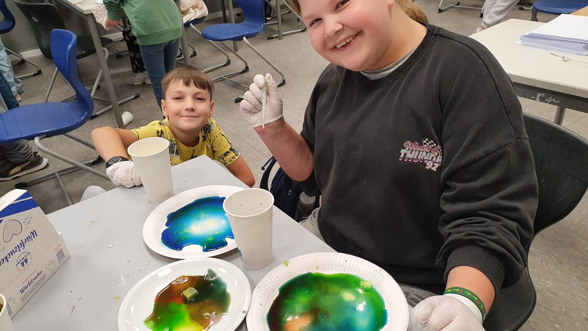 Im zweiten Experiment wurden Zuckerwürfel mit Lebensmittel und Wasserfarbe betropft. Als Folge bildeten sich sehr interessante Farbverläufe mit harten Kanten. Erst allmählich vermischten sie sich. Grundkenntnisse der Diffusion wurden vermittelt.