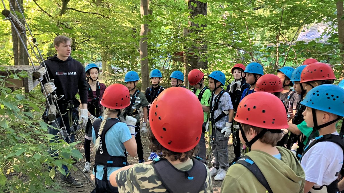 Zusammen mit ihrer Klassenlehrerin Frau Anderson fuhr die Klasse 5a der Realschule letzte Woche nach Soest in einen der größten Kletterparks Europas. Dort gab es zwei Einweisungsparcours und fünf weitere Parcours (verschiedener Schwierigkeitsstufen) mit vielen spannenden Kletterelementen und Seilrutschen. Nach dem Anlegen der Sicherheitsausrüstung und einer Einweisung wurde unter Anleitung der zwei Trainer zunächst ein Übungsparcours absolviert. Danach konnten alle Schüler/Innen entscheiden, in welcher Höhe und welchen Parcours sie klettern wollten. Das Highlight des Kletterparks ist die Europaseilbahn in 20 m Höhe.