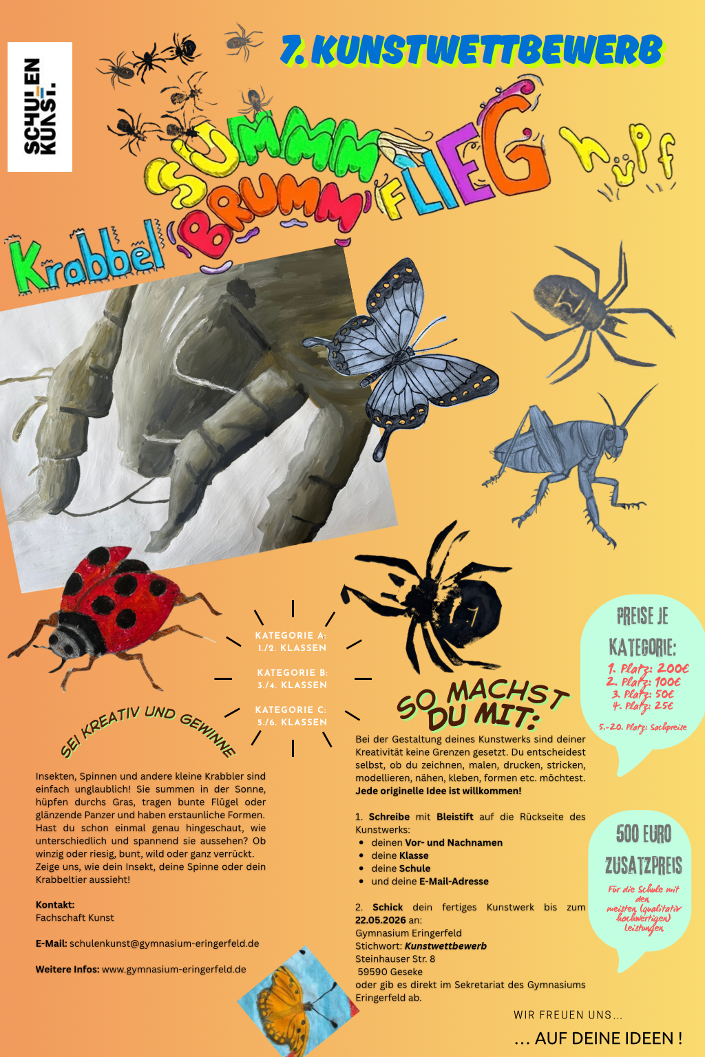 Insekten, Spinnen und andere kleine Krabbeltiere faszinieren uns. Dich auch? Liebe junge Künstlerinnen und Künstler, dann packt eure Stifte, Pinsel und Knetmasse aus! Wir rufen einen aufregenden Kunstwettbewerb ins Leben, der die spannende Welt der Insekten, Spinnen und anderer Krabbeltiere feiert. Habt ihr schon einmal eine Spinne im Netz beobachtet oder einen Marienkäfer auf einem Blatt gesehen? Zeigt uns eure Kreativität und malt oder bastelt euer liebstes Krabbeltier! Eurer Fantasie sind keine Grenzen gesetzt – alle möglichen Kunstwerke sind willkommen. Egal, ob ihr es bevorzugt: zu malen (mit Buntstiften, Wasserfarben, Wachsmalstiften), zu basteln (aus Papier, Pappe, Naturmaterialien wie Blättern und Stöcken, Pfeifenreinigern), zu modellieren (mit Knete oder Ton) oder zu fotografieren – alles ist erlaubt! Jedes eingereichte Werk ist einzigartig. Wir freuen uns auf eure kleinen Meisterwerke! Gestalte also selbst jetzt ein Kunstwerk nach deinen Vorstellungen und mach mit beim diesjährigen Kunstwettbewerb "Krabbel, summ, brumm, flieg, hüpf".