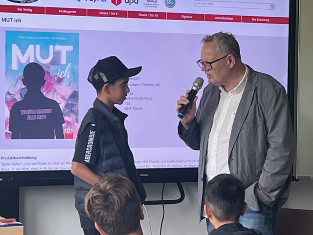 „Warum unternimmt denn keiner was? Das ist doch super gemein, was Ben da macht!“ Nach dem ersten Kapitel, welches Ulli Potofski in der gestrigen Lesung aus seinem Jugendbuch „Mut ich“ vorlas, sind viele der Kinder entsetzt. Sie wollten wissen, warum sich die Figuren so verhalten und waren neugierig, wie es wohl weitergehen mag. So gab es auf Nachfrage einer Schülerin, ob Ulli Potofski denn noch weiterlesen könne, große Zustimmung bei den anderen Kindern. Dem wurde gerne nachgegangen und so wurde auch noch das zweite Kapitel vorgelesen.