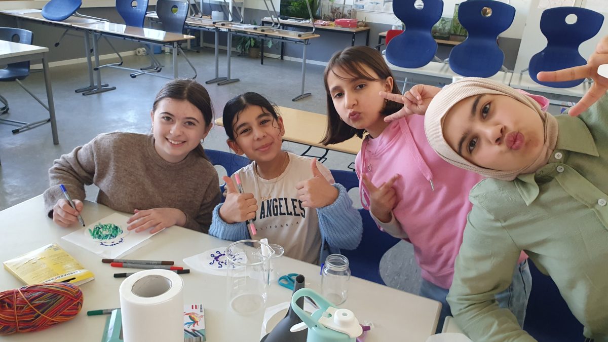 Am Freitag haben wir in der Experimente-AG Papierchromatographie durchgeführt – mit selbstgebauten Filtern aus weißen Kaffeefiltern. In die runden Filter haben wir mittig eine kleine runde Öffnung geschnitten. Rund um diese Öffnung haben wir mit Filzstiften ein buntes Muster gemalt. Anschließend haben wir einen weiteren Filter zu einem schmalen Streifen gerollt und durch die Öffnung gesteckt. Diese Konstruktion wurde in ein Glas mit Wasser gestellt, sodass der gerollte Filter ins Wasser ragte. Durch die Kapillarwirkung wurde das Wasser nach oben gezogen, die Farben begannen zu verlaufen und wanderten nach außen. Dabei entstanden beeindruckende Farbverläufe und spektakuläre Muster – ein schöner Beweis dafür, wie spannend Chemie sein kann.