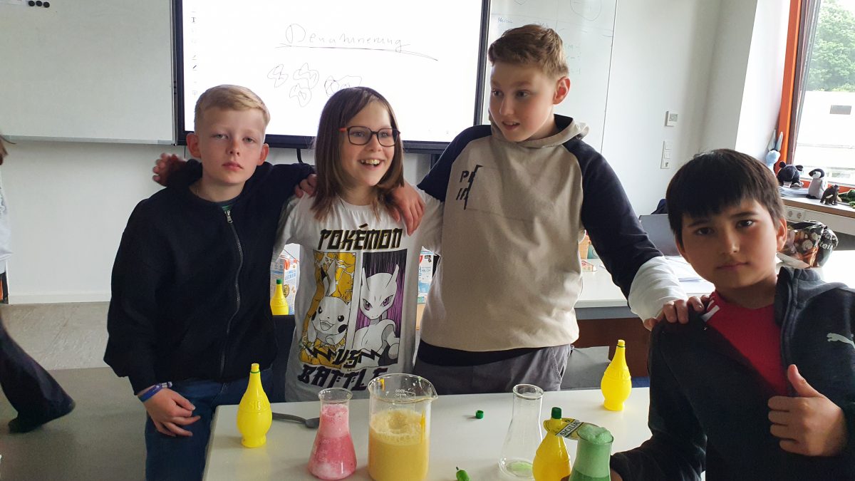 Am letzten Mittwoch führte die Experimente – AG gemeinsam mit Herrn Schwerdt den Nachweis von Proteinen durch. Dieser Nachweis macht sich das Prinzip der sogenannten Säuredenaturierung zu Nutze. Bei der Säuredenaturierung verändert sich die Struktur der Eiweiße, sodass sie wie Schneeflocken aussehen. Verschiedene Arten von Milch- und Milchersatzgetränken wurden zunächst mit Lebensmittelfarbe angefärbt, um den Effekt zu verstärken. Dann wird Zitronensäure hinzugegeben. Die Säuredenaturierung fand wie erwartet statt und wirkte sich auf die Struktur der Eiweiße aus. Am Ausmaß der Flockenbildung wurde der Eiweißgehalt abschätzbar. Besonders viel Eiweiß wurde in Kuhmilch und Sojamilch nachgewiesen.