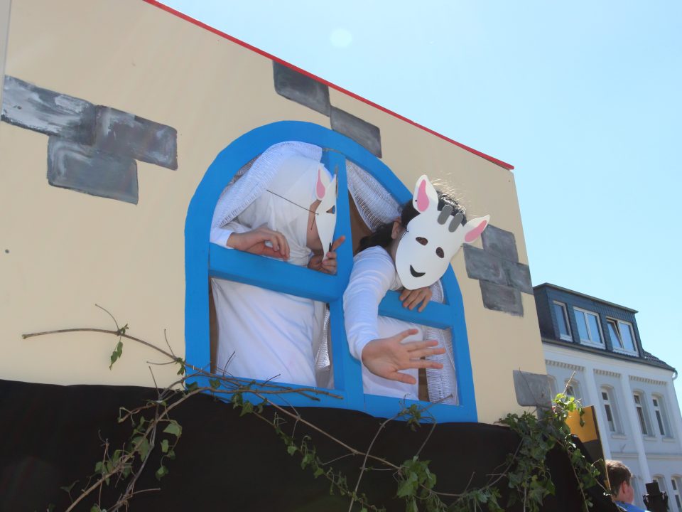 Am 05. Mai genossen die Schülerinnen und Schüler der Realschule und des Gymnasiums bei herrlichstem Sonnenschein den Umzug der Gösselkirmes. Das Thema Märchen stand im Vordergrund und wir waren mit dem Wolf und den sieben Geisslein vorort dabei.