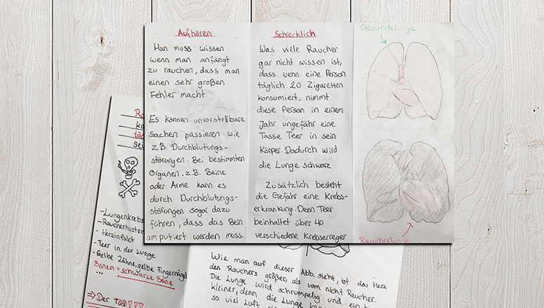Die Schülerinnen und Schüler der 6a haben im Biologie-Unterricht Informationen über das Rauchen und damit verbundene Gesundheitsgefahren zusammengetragen und darauf basierend eigentständig Anti-Rauch Flyer angefertigt, die weitergegeben und als Aufklärungsmaterial genutzt werden können.