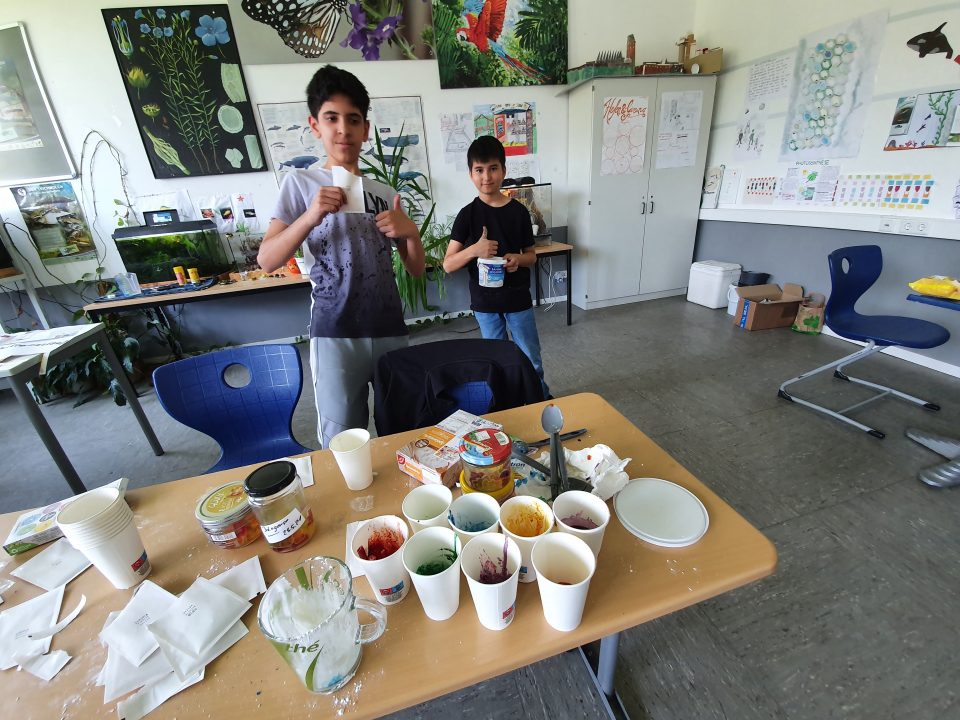 Am Mittwoch stellte die Experimente-AG ungiftig e Natur-Wasserfarben auf der Basis von Wasser, Stärke und Natron her. Durch die Mischung verschiedener Lebensmittelfarben war es möglich, eine ganze Farbpalette zu erzeugen. Die Farben müssen jetzt noch trocknen, dann können sie eingesetzt werden.