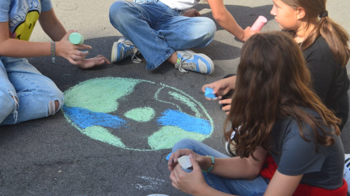 Im Anschluss folgten die Kinder dem Aufruf von UNICEF: Sie schrieben ihre Wünsche für eine bessere Zukunft auf und malten diese auf den Schulhof. So wurden ihre Gedanken und Hoffnungen sichtbar – direkt im Herzen der Schule.